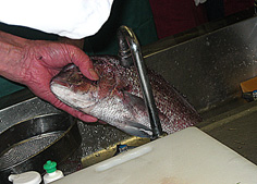 まな板を斜めにし、2~3度お湯を全体にかける。鯛の表面が縮み、周りが軽く白くなる位 |