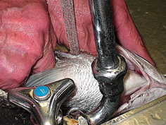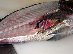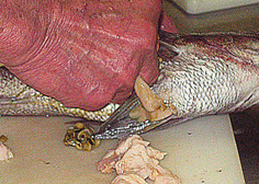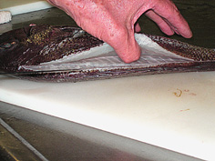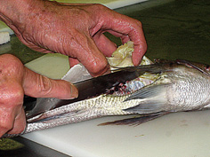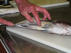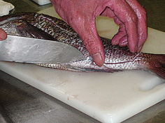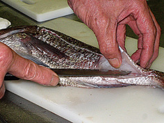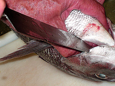 胸びれを持ち、かま下に包丁をいれ、中骨を切り落とさないよう手前で止める |