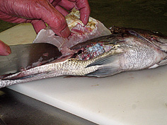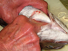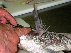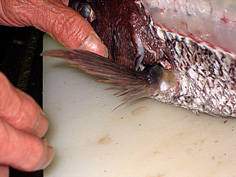 胸びれを立て、左側の3~4本ほどのところを切り(切り落とさないこと) |