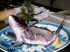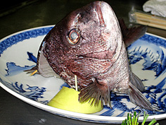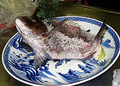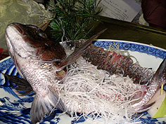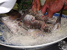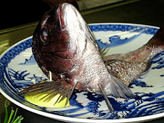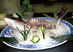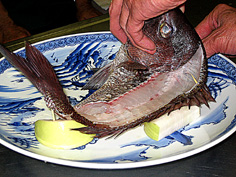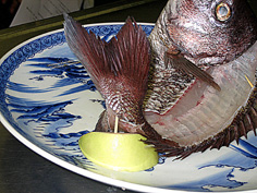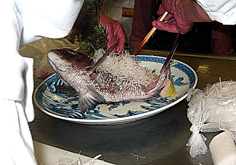 大根を斜めに切り、妻楊枝を挿し、鯛のエラに差し込む。左奥の背びれの状態も写真で良くわかる |