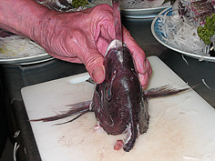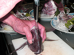 左手でしっかり頭を持ち、包丁を右下におろす様に切る | |