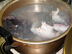 アラを加えて、アクを取りながら暫く煮込み、塩、酒で調味する | |