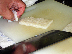 生いかは皮を下にして、斜めに切り落とさないように細かく切り目をいれる。反対側も格子目に切り目をいれて、松かさになるようにする | |