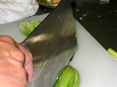 チンゲン菜は葉を切り落とす。今回は茎のところだけ使う。縦に6等分し、軽くボイルしておく |
