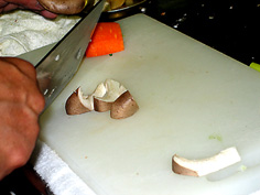 生しいたけは軽く切れ目を入れてから、半分にする | |