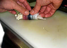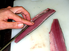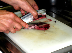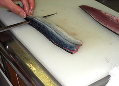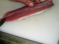 腹骨をすき取る。包丁を寝かせて、骨だけを綺麗に取る。 |