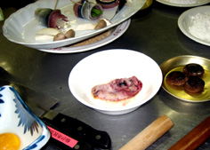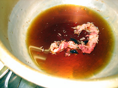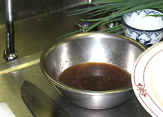 秋刀魚用の調味料を合わせて火にかけ、沸騰したら肝を入れ4〜5分煮る。これをザルで漉し、こした汁を冷ます (残った内臓は生姜のしぼり汁をたらし、酒の肴にする) |