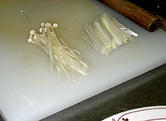 えのき茸、短冊に切ったネギ(白いところ)、2cm幅に切った海苔を用意 |