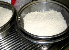 茸は食べ易い大きさに準備。炊飯器に米を入れ、酒・薄口醤油・砂糖少々で味をつけ、茸をのせて炊く |