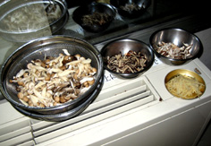 材料 4人分 米 2合 秋刀魚 1尾 干し椎茸 2枚 ブナシメジ・マイタケ等 適宜 針ショウガ 適宜 海苔・小ネギ 少々 |