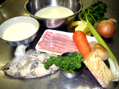 材料 4人分 たまねぎ 100g にんじん 40g じゃがいも 40g セロリ 20g ベーコン 70g バター 10g 牛乳 450cc 生クリーム 250cc 強力粉 大さじ1/2 カキ 12粒 白ワイン 100cc ソフトクラッカー 2枚 パセリのみじん切り 敵量 ※ペーパータオル用意 |