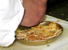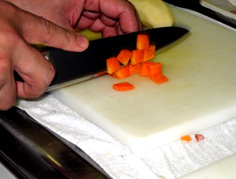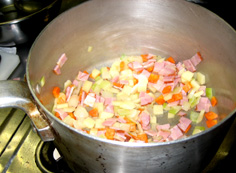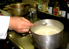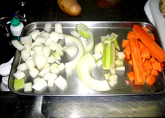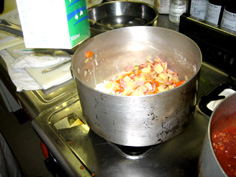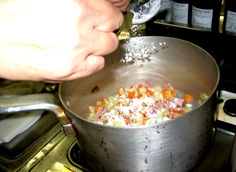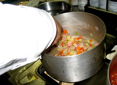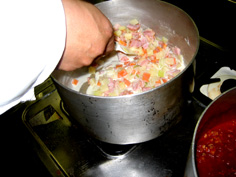 最初に、にんじん・セロリ・たまねぎを炒める。この時、塩少々を振って味を引き出す | |