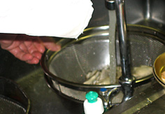 ザルにペーパータオルを敷き、カキをあけて漉す | |