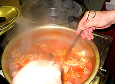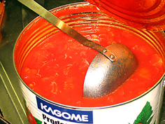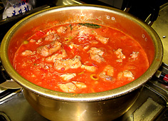 大きい鍋に、にんにくとオリーブオイルを入れ弱火にかけ、香りが出たら鶏ももを入れる。白ワインと酢を加えて水分を飛ばすように煮つめ、ハーブとケッパー、オリーブの実、ダイストマトを入れて煮込む。肉に火が通ったら、一旦取り出す。残りのトマトソースを煮つめる。 |