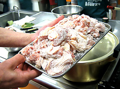 ※チキンのトマト煮込み猟師風 材料 40人分 鶏もも 3㎏ ダイストマト1缶 2、1㎏入り にんにく 3片 白ワイン 100cc 酢 50cc 塩・こしょう 適宜 薄力粉・オリーブオイル 適宜 |