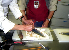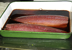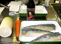 ※しめ鯖バルサミコ風味 材料40人分 鯖 4本 あら塩 適量 酢(米酢) 250cc バルサミコ酢 75cc ※付け合せ 大根 15cm 人参 5cm 水 500cc 塩 37.5g ※かけタレ 酢 100cc バルサミコ酢 25cc 砂糖 50g 塩 適量 |