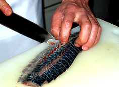 鯖を冷蔵庫から出し、水気をふき取り、中骨を抜き皮をむく |
