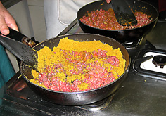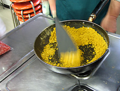 ごはんと煮込んだ材料を混ぜる(本来はごはんの上にかけるが量が多いので今日は混ぜた) アルミのカップに盛り、チーズを散らしオーブンで10分位焼く |