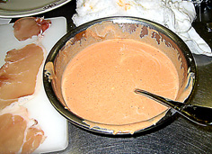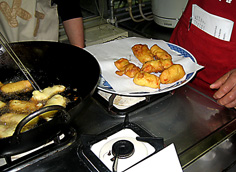 バットに入れ、塩、コショウ、レモン汁、微塵に切ったバジルの葉、オリーブオイルをかけ馴染ませておく。フリッターは油をまぶしておくとカラッと揚る | |