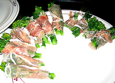 生ハムの上に菜の花をのせ、ソースをスプーンでかけ巻く | |