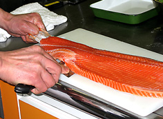 ※サーモンのフリッター 材料 40人分 銀鮭 半身4枚 レモン汁 適量 バジルの葉 5本 オリーブオイル 適量 塩・コショウ 適宜 揚げ油 適宜 ※フリッターの衣 薄力粉 250g 卵黄 5個 生ビール 360cc 卵白 5個 サーモンは皮を引く |