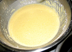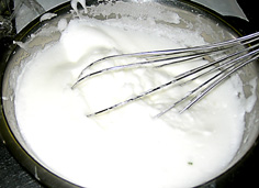 卵白をしっかり泡立て、上のボウルと混ぜる。ゴムベラで泡をつぶさないように下から丁寧に混ぜる | |