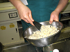 ※筍入りメンチカツ 材料 40人分 合挽き肉 1.5s 玉ねぎ微塵切り 500g 卵(肉用3個、衣用2個) 5個 生パン粉 100g 筍水煮 250g トマトケチャップ 75g おろしにんにく 1片 塩・コショウ 適宜 ミックスチーズ 250g ※カツの衣用 薄力粉・生パン粉・溶き卵・揚げ油 各適量 玉ねぎの微塵切りをサラダ油で炒め冷ましておく |