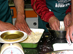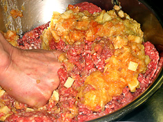 肉を加えて、粘りが出るまで良く練る。最後に筍とミックスチーズを入れ、混ぜる | |