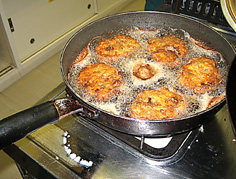 これを60g位に計り丸める。薄力粉、卵、パン粉の順に付けて形を整える。真ん中を少しくぼませる | |