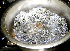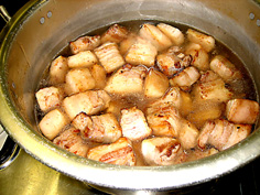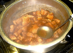 鍋に肉とタレを合わせ、落し蓋をして40分煮込む。水気が足りなくなったら途中で水を足す | |