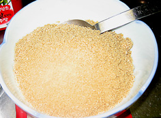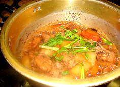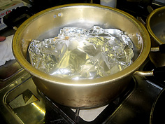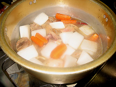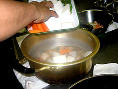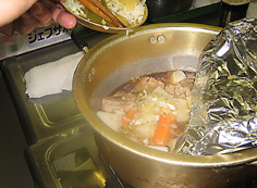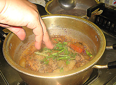 上下を時々返して15分ほど煮込み、このような状態に煮汁が少なくなったら火を強めて鍋返しをして汁気を飛ばす。せりを入れる |