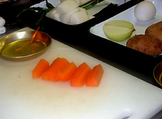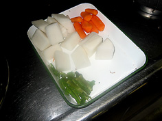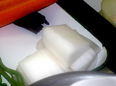 大根を5cm位に切り、6等分に切る。煮崩れないように面取りをしておく |
