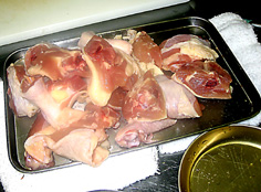 鶏に、おろししょうがとコショウをしっかりすり込んで下味をつける |