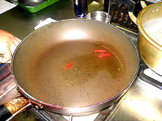 フライパンにゴマ油大さじ2を入れ、種を取った唐辛子を加えてから火にかける |