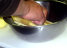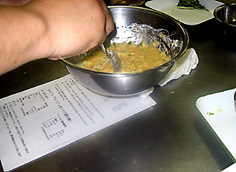 良く混ぜ、硬さを調節する。硬いときは取り除いておいたジャガイモの水分を加える。塩、小さじ1とコショウをふる |