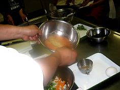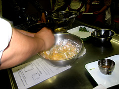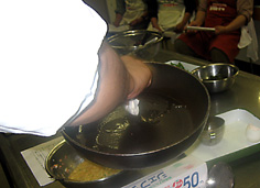ジャガイモから水気がでるので、真ん中にたまった上澄みの水を捨てるが、この水分は取っておく |