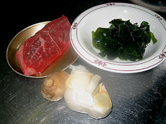 材料 4人分 牛肉(筋肉でもモモ肉でも可、また塊でも薄切りでも可) 100g 三陸産わかめ(戻して) 100g おろししょうが・おろしにんにく・ネギ 適宜 擂りゴマ 大さじ1 ※調味料 醤油 30〜40cc 韓国ダシの素(なければ、ほんダシでも) 大さじ1 砂糖 大さじ1 |