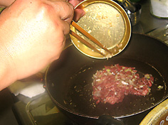 フライパンにゴマ油小さじ1を引き、牛肉を炒める |