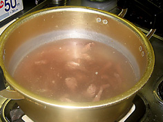 水600ccを加え、塩を少し入れて沸かす。ここの塩はアクを取りやすくするため |