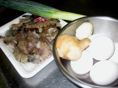 材料 4人分 玉子(溶いておく) 4〜5個 芝エビ(小エビ) 150g 長ネギ 1本 ショウガ 30g ニンニク 2片 |