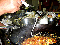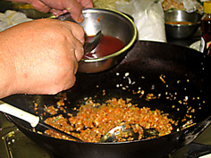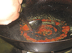 油少々で豆板醤を炒める。辛さと香りを引き出すため。焦がさないように注意 |