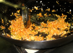 香りが出たらネギ、ショウガ、ニンニクを加え炒める |