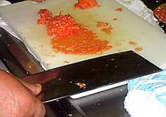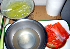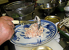 鮭は叩いて細かくしてから、庖丁の面ですり身にしておく |