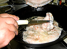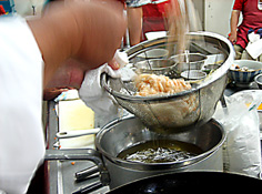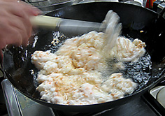 鍋に綺麗な油をたっぷり入れ、120〜130度位の低温に温める |