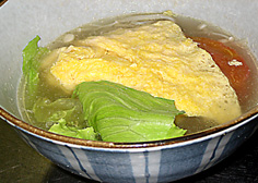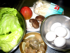 材料 4人分 玉子 4個 生椎茸 3枚 えのき 1袋 レタス 3〜4枚 ザーサイ薄切り 4〜5枚 湯むきトマト 中1/2個 |