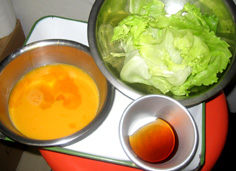 ※合わせ調味料 (酒 大さじ2 塩 小さじ1 コショウ少々 薄口醤油 大さじ1 ゴマ油 小さじ1) 玉子を溶き、酒大さじ1、塩小さじ1/3、コショウ少々を加えておく。レタスは洗う。 |