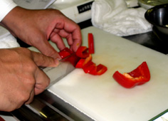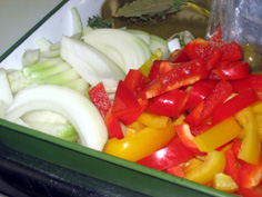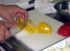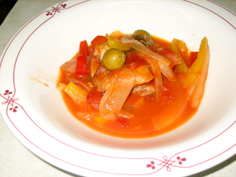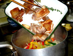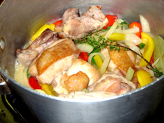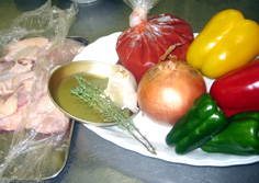 材料 4人分 石巻産森林鶏モモ肉 70g×4枚 玉ねぎ 150g パプリカ(赤・黄) 各1/2個 緑のピーマン 1個 にんにく 2片 タイ (生) 2枝 ローリエ 1枚 グリーンオリーブ(種抜き) 8個 トマト水煮缶(ダイスカット) 200g ピュアオリーブオイル 35cc 白ワイン(辛口で安価な物) 80cc ケチャップ 少々 白コショウを用意 |