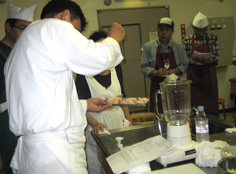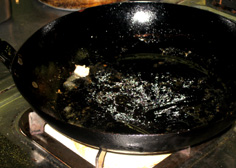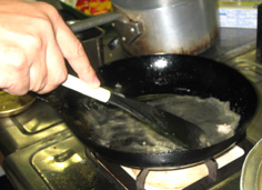 底に残っているうまみを、へらでこそげとり、そのまま置いておく |