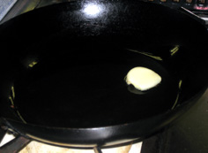 フライパンにオリーブオイル20ccを入れ、つぶしたにんにくを塊のまま炒める |