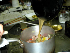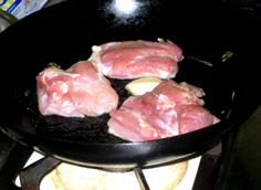 ここで鶏肉とにんにく、タイ 、ローリエを入れ |